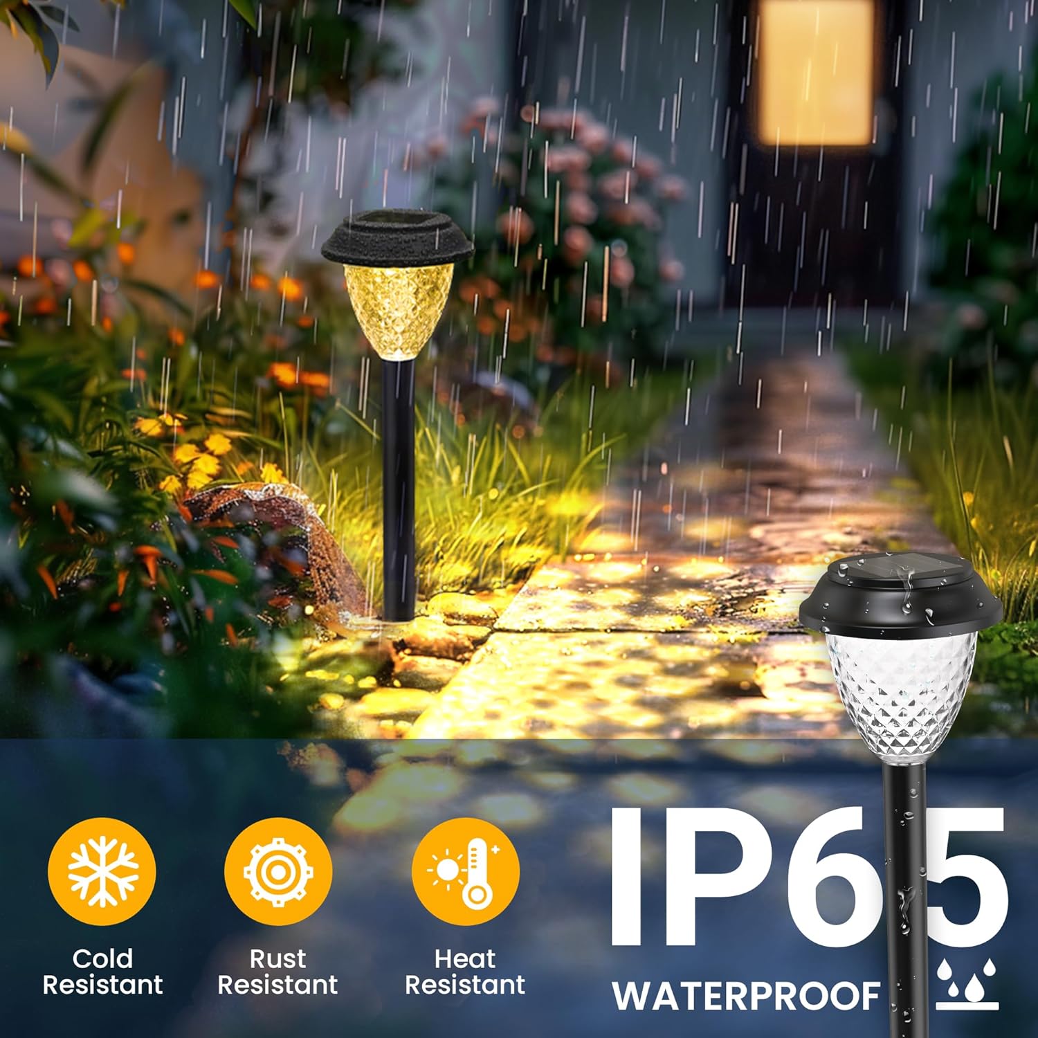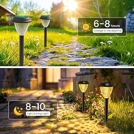 Powered by solar energy, the lights automatically turn on at dusk and off at dawn, providing 8–10 hours of illumination on a full charge. Built with an IP65 waterproof rating, they are rust-resistant and designed to withstand rain, snow, frost, and harsh outdoor conditions.