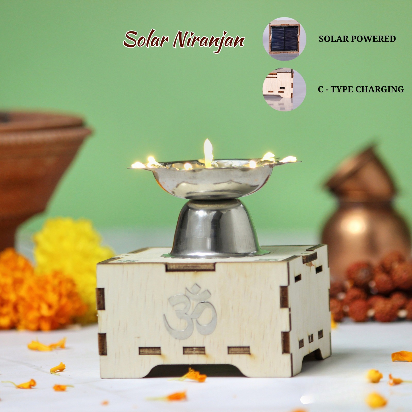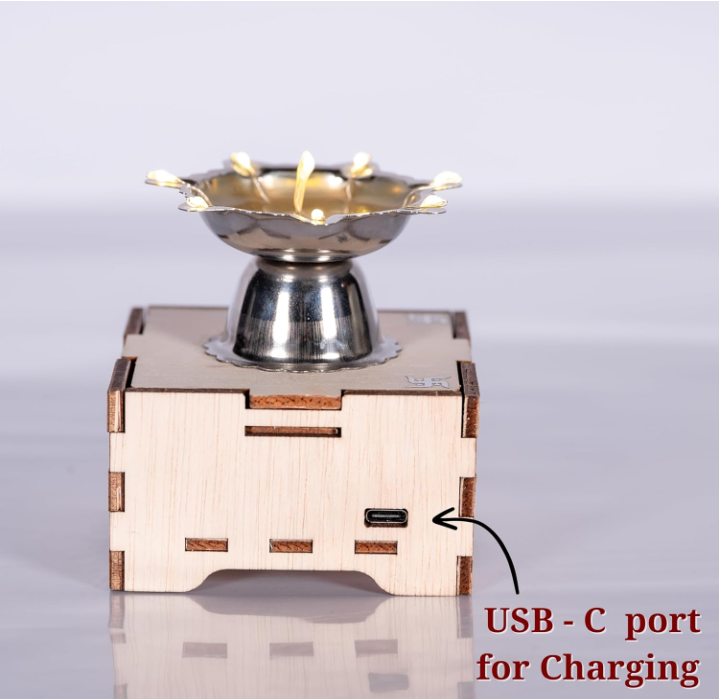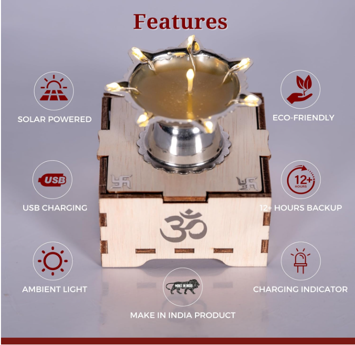 Elevate your pooja space with the serene glow of the Solar Niranjan Diya. Designed for modern devotion, it is solar powered with C-Type charging support, offering a clean, oil-free, and peaceful lighting experience for daily rituals and sacred moments.